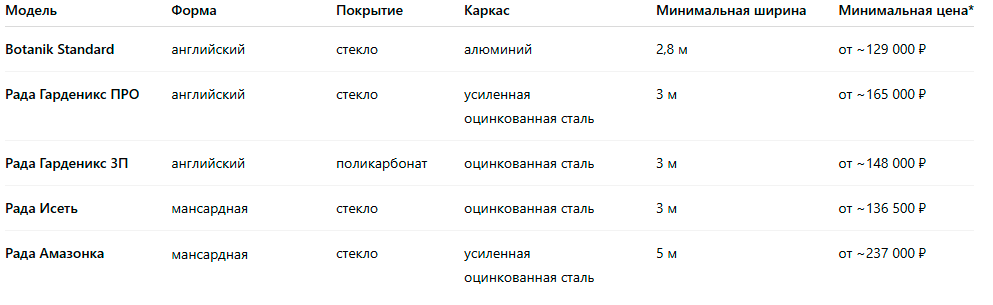 * Цены ориентировочные, указаны для базовой комплектации без дополнительных опций (закалённое стекло, покраска, автоматика, фундамент и т. п.).